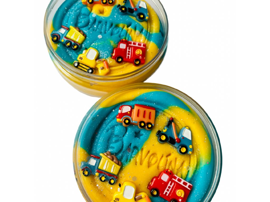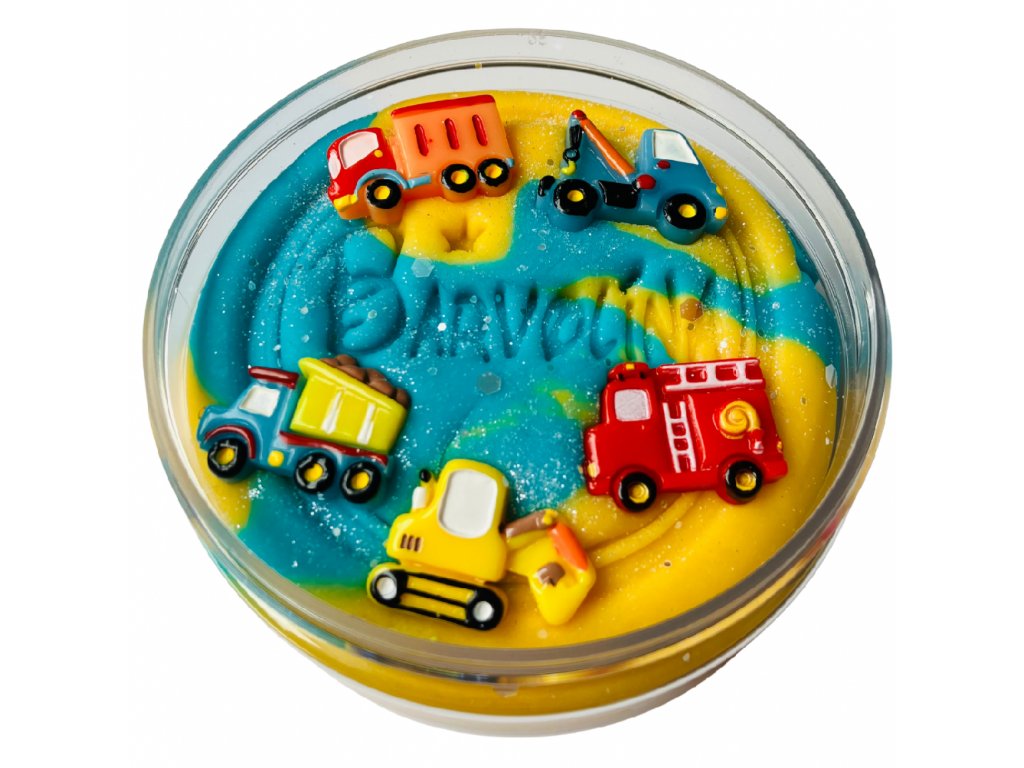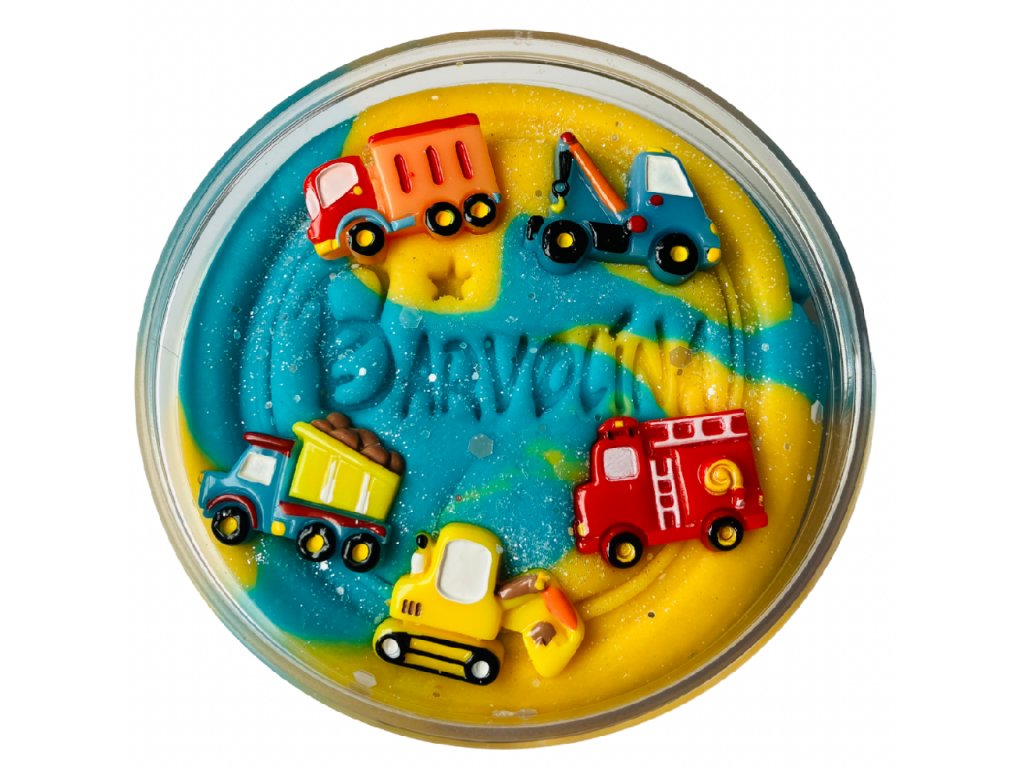 250g dvoubarevné BARVOLÍNY. Barvolína stavba obsahuje 5 stavebních aut, barva žlutá a tyrkysová plus třpytky.